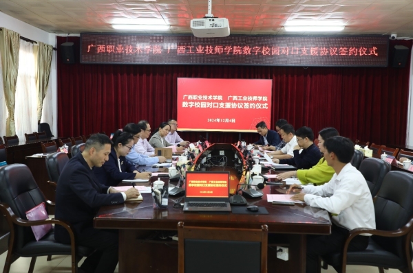 为贯彻落实国家和自治区关于网络安全与信息化工作的战略部署,加强新时代教育管理信息化工作,深化两校在教育信息化领域的合作,共同推进数字校园建设,根据双方达成的合作意向,于12月4日下午,学校与广西工业技师学院数字校园对口支援协议签约在平房四第一会议室举行,学校党委副书记、校长黄永春,广西工业技师学院党委书记、院长莫创才等相关领导参加了签约仪式并举行座谈交流。会议由学校党委委员、副校长林松主持。