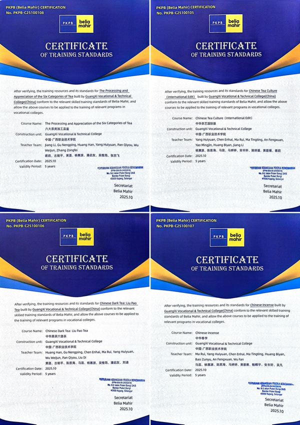学校在本次论坛上成果丰硕,载誉而归。凭借在中马教育国际合作领域的突出成果,获评“2024-2025中马教育国际合作卓越贡献奖两名教师被聘为中马产教国际合作中心中马联合专家委员会中方专家库专家;校自主研发的《中华茶艺国际版》《中华香学》《六大茶类加工品鉴》《中国黑茶六堡茶》四门课程培训资源及其标准,通过马来西亚全国职业工友会正式认证,将被纳入马来西亚高职院校相关课程体系,为当地学生提供标准化的中华传统技艺培训实现校职业教育资源国际化的重要突破,也是中马文化与技能交流的生动实践。
