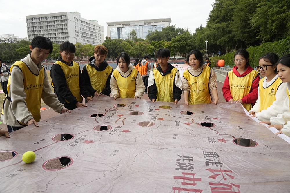 拓展教练通过热身破冰活动,打破陌生,引导学生迅速融入团队;通过“合力建塔”“重走长征路”“车轮滚滚”“健球大作战”“团队动力圈”等趣味团队项目开展小组对决。