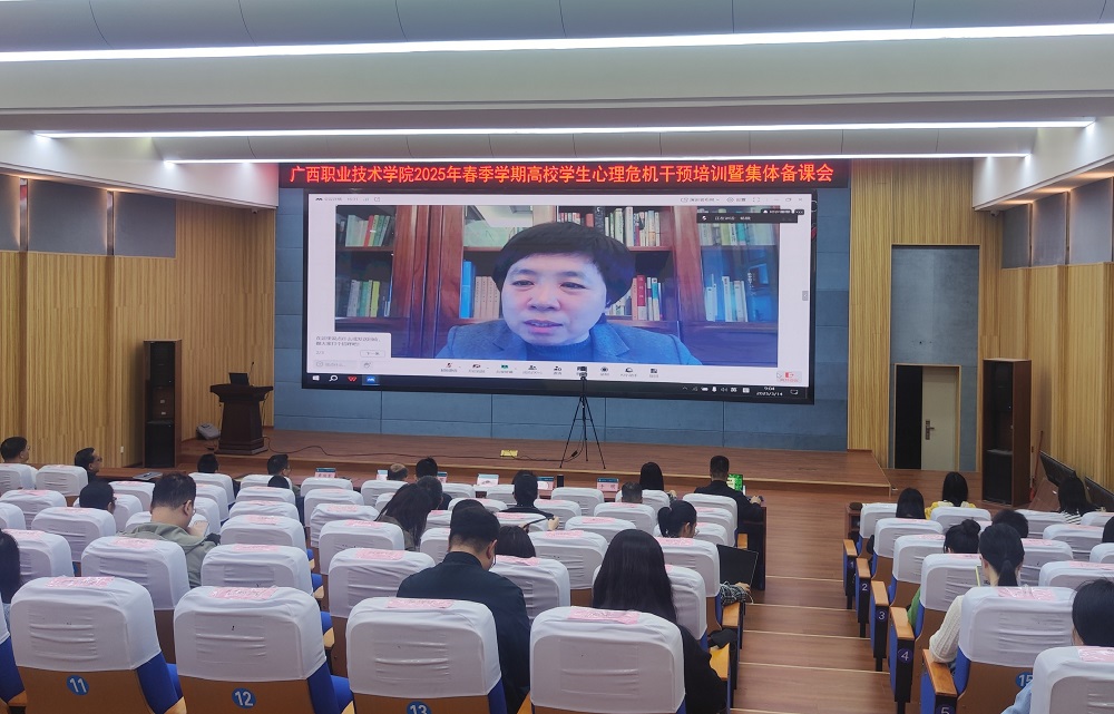 3月14日,自治区教育厅举办2025年春季学期全区高校心理危机干预网络培训暨集体备课会,以增强心理健康教育教师对学生心理健康问题的分析与研判能力。学校组织心理健康教育专兼职教师、全体辅导员、班主任代表在第三教学楼报告厅参加了此次培训。