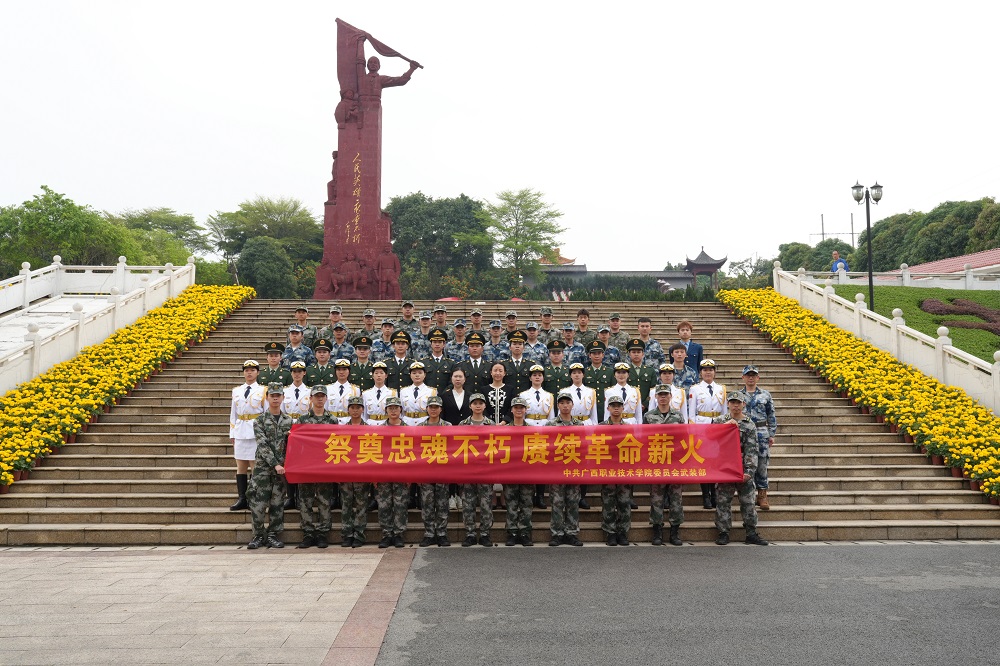 4月8日上午,学校党委武装部组织师生代表60人赴广西壮族自治区烈士陵园,开展"缅怀革命先烈·传承红色精神"清明祭扫活动。学校国旗护卫队、兵心协会成员、兵心班学员通过庄严仪式,表达对英烈的深切缅怀。