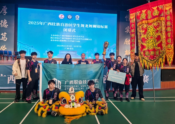 11月6日,2025年广西壮族自治区学生舞龙舞狮锦标赛圆满落幕,学校龙狮协会代表队奋勇争先、表现出色,在“男子南狮规定套路”项目高职高专组/体育专业组的激烈角逐中,荣获全区第一名的优异成绩。