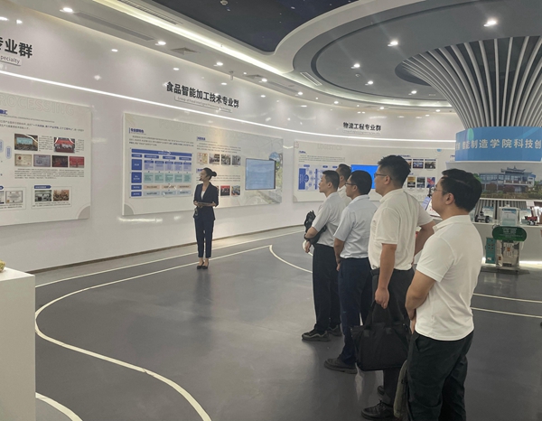 与会人员参观学校产教融合大楼科技展厅,了解学校专业建设与科技创新成果