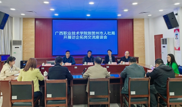 在与贺州市人社局座谈会上,双方就人才培养展开深入交流,重点对技术革新、人才结构、培训需求和劳动力市场现状等进行全面探讨。贺州市人社局党组成员、就业中心主任张邦平介绍了贺州市产业园区发展情况,产业园区规划、入驻企业用工需求等。周治结合学校专业设置、毕业生情况,与贺州市企业就人才培养及高校毕业生就业工作作了交流。