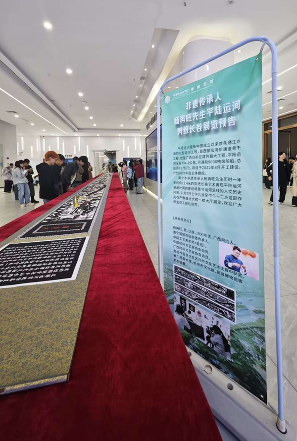 11月7日上午,南宁市非遗传承人、九零后剪纸艺术家杨再旺历时一年创作的剪纸长卷《龙腾运河》在万象城网页版首次展出,艺术再现了平陆运河建设的宏大场景与沿岸人文风貌。学校副校长周治出席展览并观看作品。