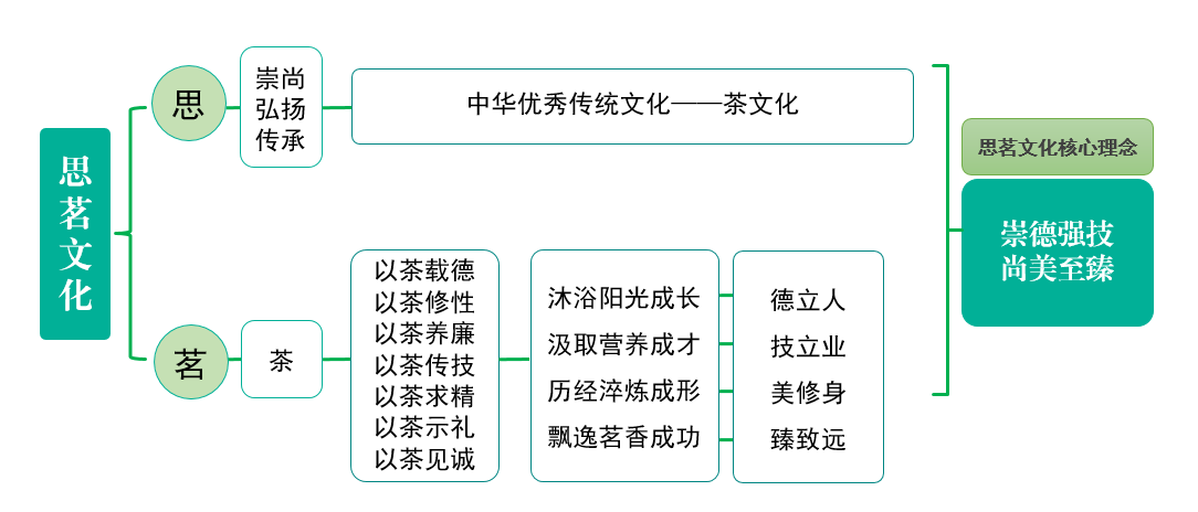 释义:学校“思茗”核心文化理念是一个有机整体,“崇德”为前提、“强技”为要求、“尚美” 为根本、“至臻”为目标,贯穿于师生成长成才的全过程,是学校培养德智体美劳全面发展的社会主义建设者和接班人的使命担当。