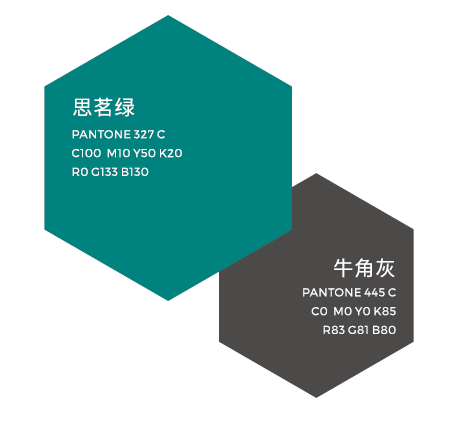 标准色为:思茗绿(R:0 G:133 B:130;C:100 M:10 Y:50 K:20)和牛角灰(R:83 G:81 B:80;C:0 M:0 Y:0 K:85)。